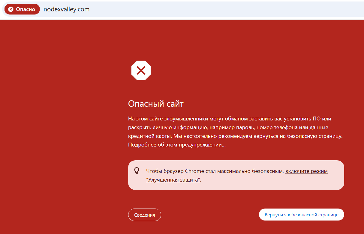 Официальный сайт биржи Nodexvalley – nodexvalley com. При попытке попасть на платформу браузер выдал предупреждение, что это опасный сайт. Он заподозрен в краже личных, платежных и контактных данных посетителей. Это уже настораживающий момент, который часто говорит о мошенничестве.