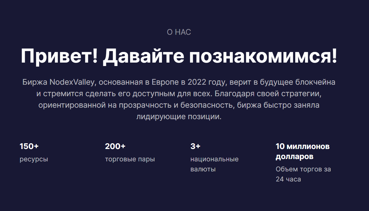 В разделе «О нас» написано, что платформа Nodexvalley работает с 2022 года, основана в Европе. Создатели хвастаются сотрудничеством с крупными банками и компаниями, суточным торговым оборотом более 10 000 000 долларов.