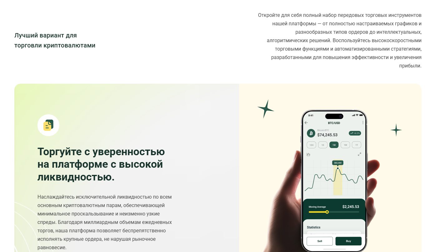 Здесь возможна спотовая и маржинальная торговля криптовалютами с кредитным плечом до 100х, низкими комиссиями и быстрым исполнением ордеров. Также есть функция автотрейдинга. Владельцы уверяют в исключительной ликвидности, которая позволяет им гарантировать минимальное проскальзывание и узкие спреды.