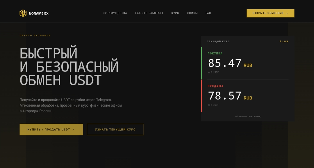 NoName Ex ru – обменник, который работает с USDT и рублями через телеграмм-бот NoNameEx bot и четыре офлайн офиса. В этом обзоре разберемся, как именно работает площадка и какие есть риски. Выясним, насколько выгоден обмен, какие документы предоставлены и что говорят реальные пользователи.