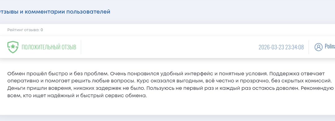 ​Несмотря на то, что единственный комментарий является положительным, такого объема данных недостаточно для объективной оценки надежности площадки. Из-за отсутствия длительной истории работы и массовых подтверждений от пользователей, репутация сервиса остается под вопросом. Независимые агрегаторы также пока не содержат полноценной статистики.