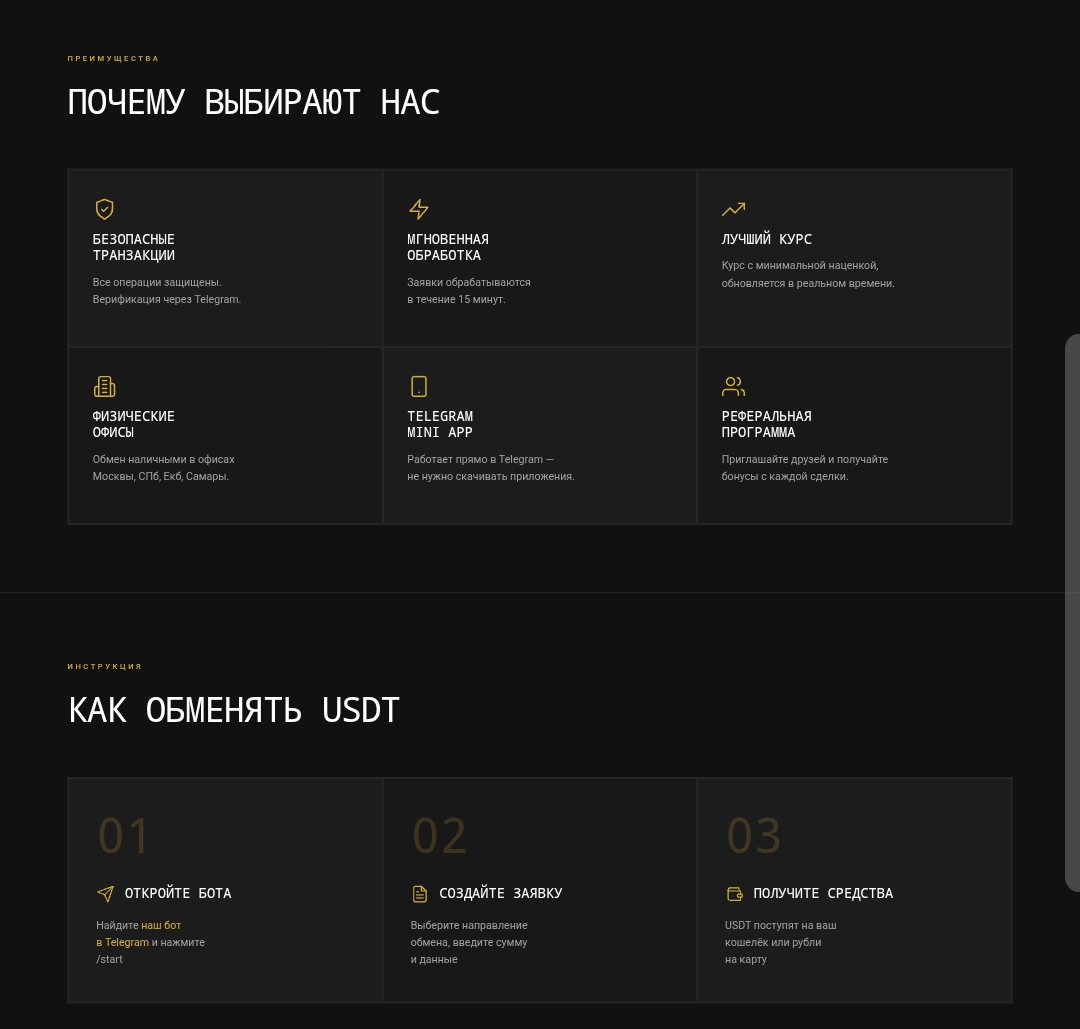 Чтобы совершить обмен, пользователь запускает бота, нажимает start, выбирает направление, вводит сумму и реквизиты карты либо криптокошелька. Курс подтягивается в реальном времени, а минимальный лимит не отображается, что заставляет каждый раз спрашивать поддержку. Из плюсов NoName Ex ru можно выделить отсутствие отдельного приложения, наличие живых офисов и бонусы за приведенных друзей.