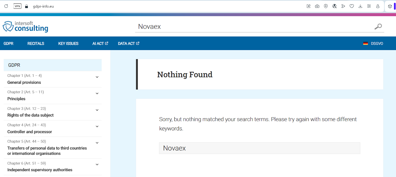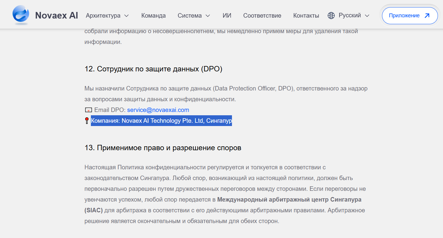 Проект подчеркивает международный масштаб. На сайте указано, что компания Novaex AI Technology Pte. Ltd якобы зарегистрирована в Сингапуре, используется инфраструктура Cloudflare, заявлено соответствие GDPR и PDPA, пользовательское соглашение описано на десятки страниц.