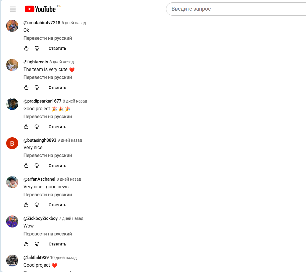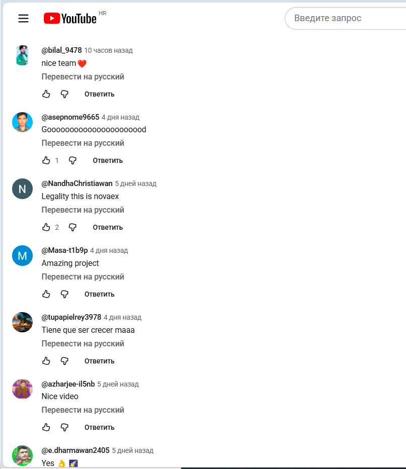 Отзывы клиентов сводятся к формальной активности под видео и постами проекта. Это короткие комментарии без описания опыта, сроков работы, сумм, рисков или вывода средств.