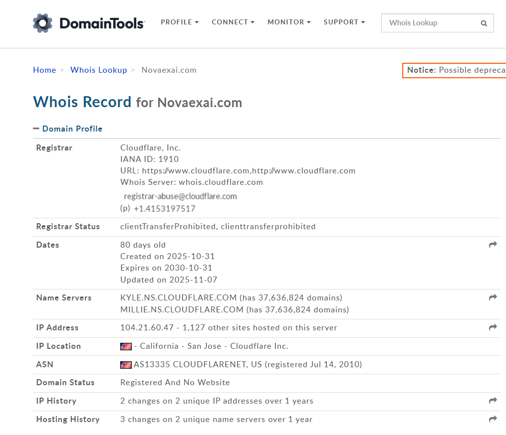 Домен Novaex Ai1 зарегистрирован 31 октября 2025 г. На январь 2026 г. сайту около 80 дней. Это небольшой срок для проекта, который называет себя глобальной AI-платформой с институциональным уровнем решений.