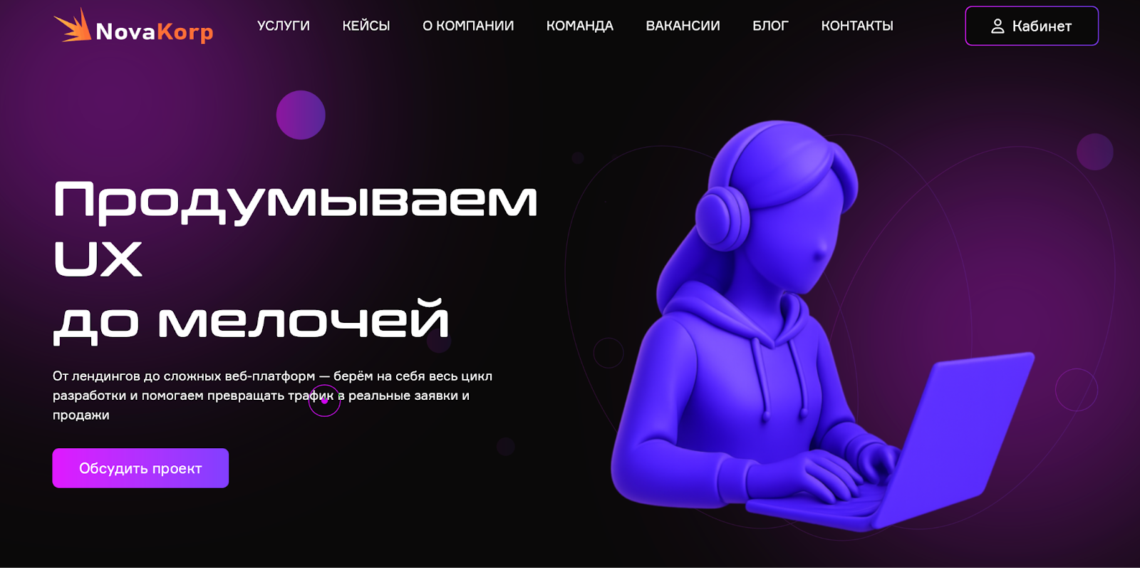 Novakorp позиционируется как студия разработки. Здесь якобы создают сайты, web‑сервисы и мобильные приложения «под ключ». Также предлагается разработка от лендингов до сложных платформ, тестирование, поддержка, UX/UI‑дизайн. На сайте компании указаны сроки, цены от 120.000 ₽.