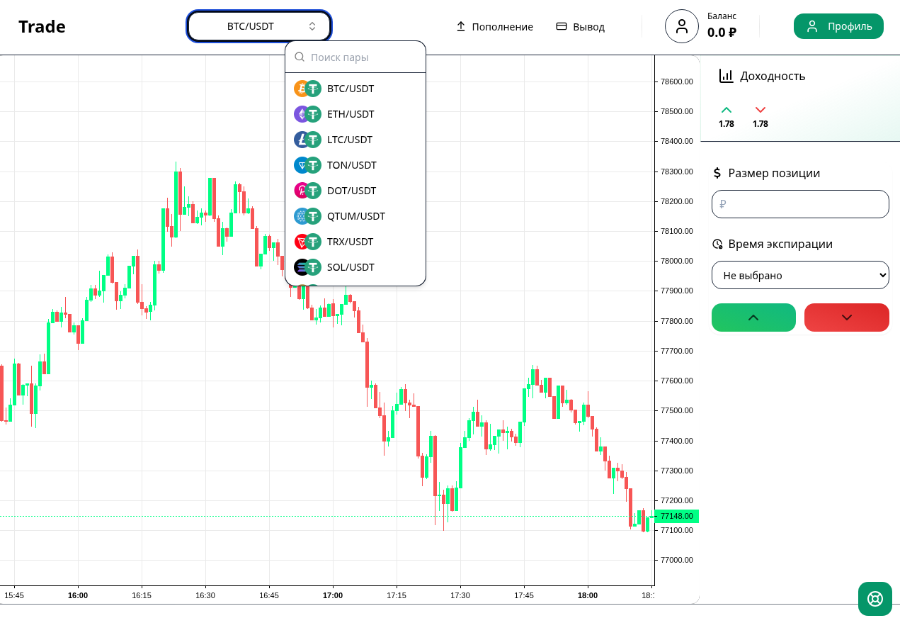 Никакой информации об объемах торгов, глубине рынка или ликвидности на сайте нет. Сами по себе котировки на экране ничего не доказывают — отображение цен и реальное исполнение сделок совершенно разные вещи. Есть ли за красивым интерфейсом реальный торговый движок — проверить не получится.