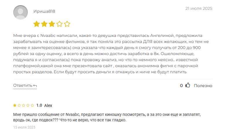 Сомнительный проект Nvaabr tv предлагает зарабатывать на отзывах по оценке разных фильмов, размещаемых на платформе. За несложную работу компания обещает достойную, стабильную оплату. Но детали работы пользователь узнает только после регистрации.