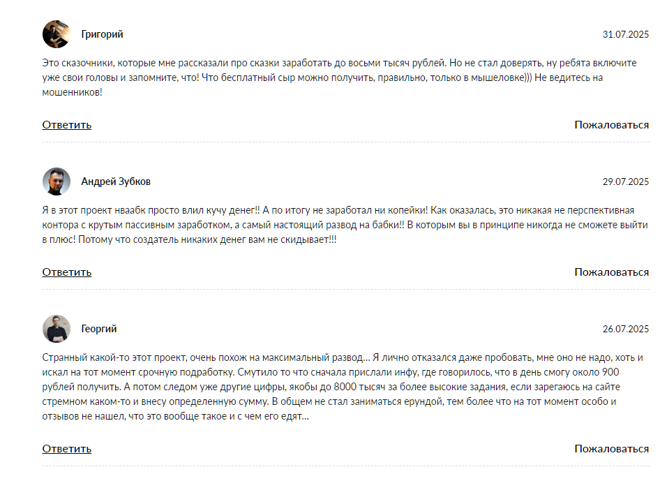 Негатива в сети про работу с этим скам проектом очень много. Люди сообщают, что на них выходили через социальные сети или через друзей. Предлагали отлично зарабатывать всем, уверяли, что для работы не надо никакой квалификации. Достаточно иметь смартфон и свободное время.