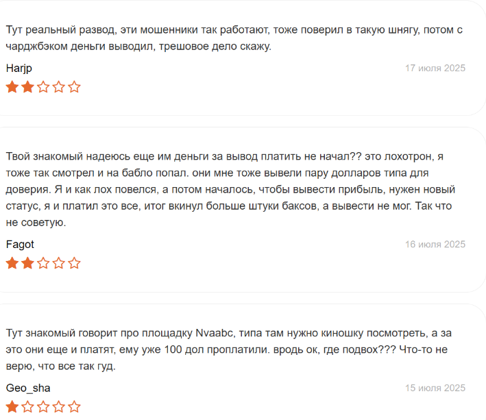 Про сотрудничество с Nvaabr отзывы опытных пользователей сети и новичков одинаковые. Люди в надежде хорошо заработать оплачивали более высокий уровень доступа к получению разных платных заданий. Сначала им немного платили, но потом просто блокировали доступ в личный кабинет.