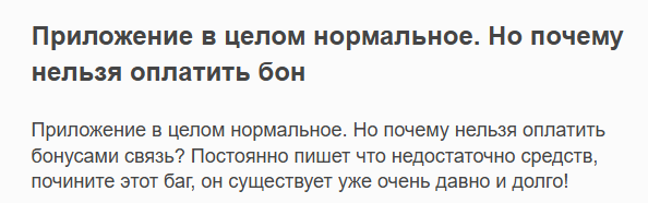 Второй пользователь отмечает, что ему нравится сервис, однако оплата связи затруднена из-за багов приложения.