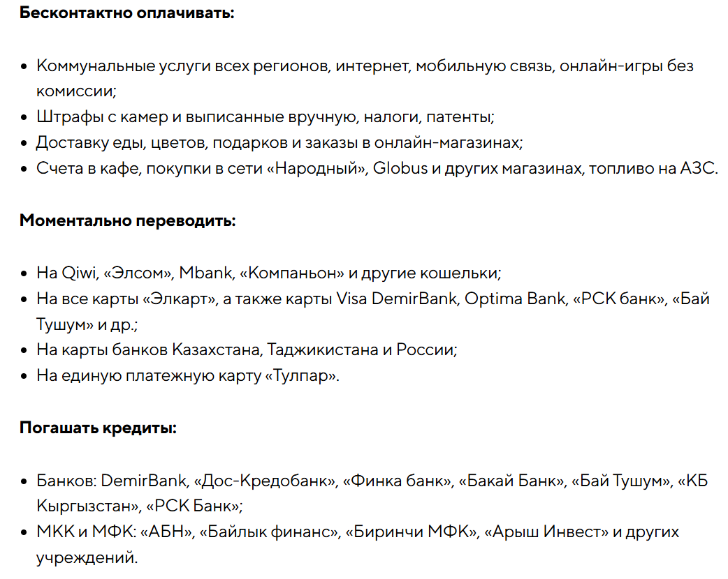 Согласно данным с официального сайта, кошелек O Dengi позволяет осуществлять моментальные переводы на банковские карты и оплачивать более 800 сервисов. Его пополнение возможно с баланса мобильного телефона или через терминалы на территории Кыргызстана.