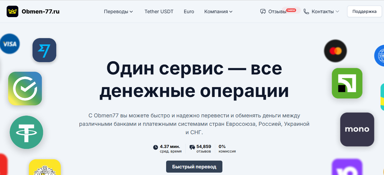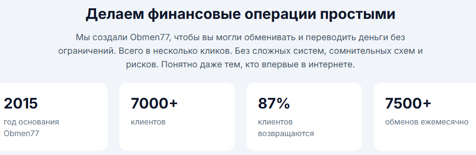 Обмен 77 — онлайн-сервис, который предлагает пользователям обмен фиата и стейблкоинов через сайт и Telegram. Площадка заявляет быстрые транзакции, отсутствие регистрации. Кроме того, рекламируется широкий выбор направлений. Однако подтвержденной информации о юридическом статусе и финансовой прозрачности проекта нет. С мониторингами команда Обмен 77 не сотрудничает.