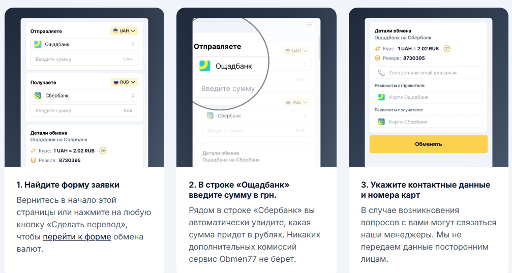 Обмен осуществляется через форму на сайтах Обмен 77 Ru или Обмен 77 Сом без создания аккаунта. Для проведения операции необходимо указать сумму, реквизиты и оплатить заявку.