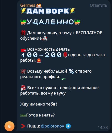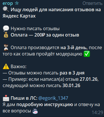 Судя по содержимому новых каналов, обмен отзывами уже не ведется. В ленте видны только предложения покупать отзывы за деньги и сомнительные предложения по заработку, судя по которым, их авторы готовы платить сотни тысяч рублей за работу, не требующую опыта или навыков.