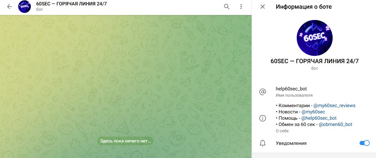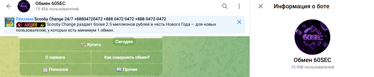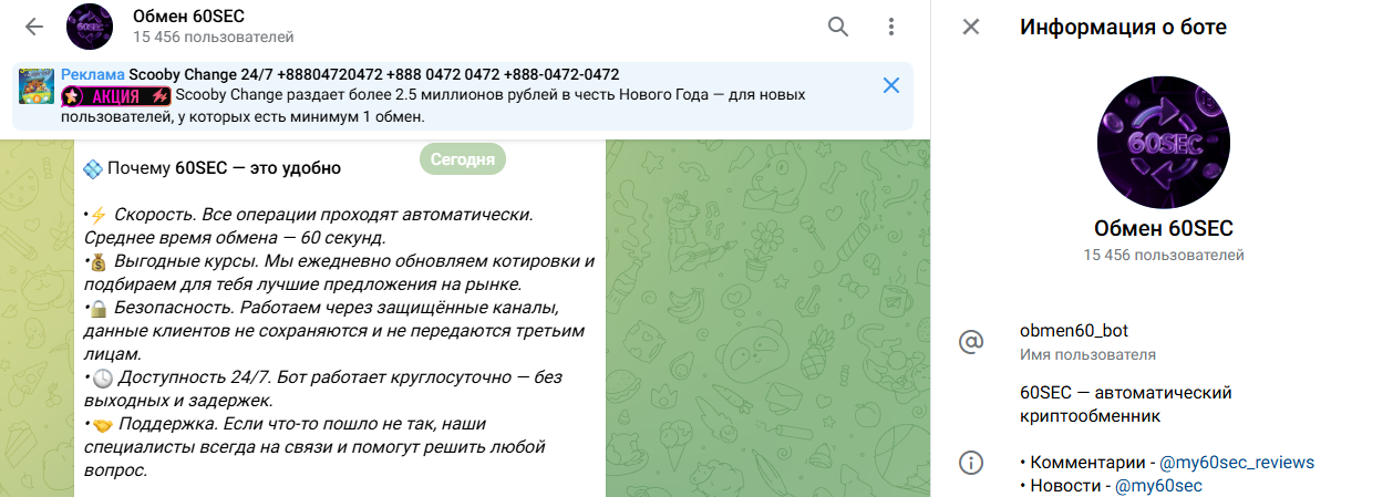 Хоть команда проекта Обмен 60SEC и называет свой обменник самым надежным и быстрым, но при выборе подобных интернет ресурсов важно учитывать репутацию. Здесь данный показатель крайне низкий, ведь социальные сети и сам бот начал работать лишь 30 октября 2025 года, а разработчики остаются анонимными. При этом в интернете есть реальный обменный пункт 60Sek net, который упоминается на BestChange, однако он никак не связан с данным тг обменником и даже наоборот, создатели бота могли использовать их марку для привлечения внимания.