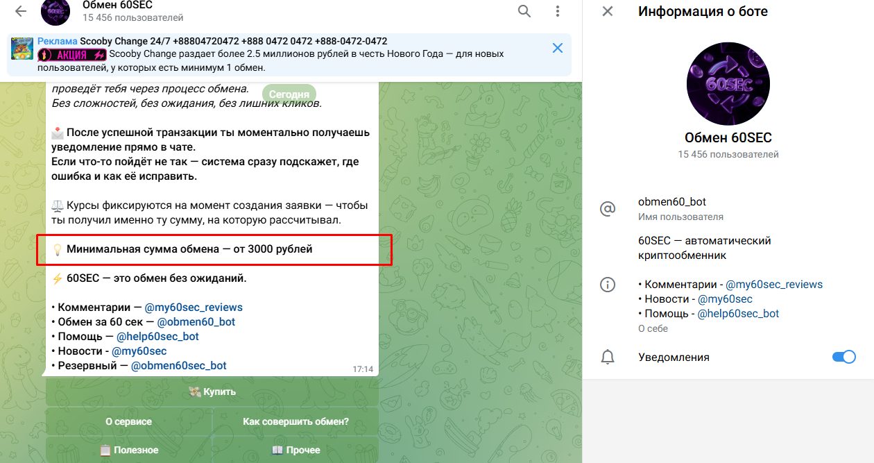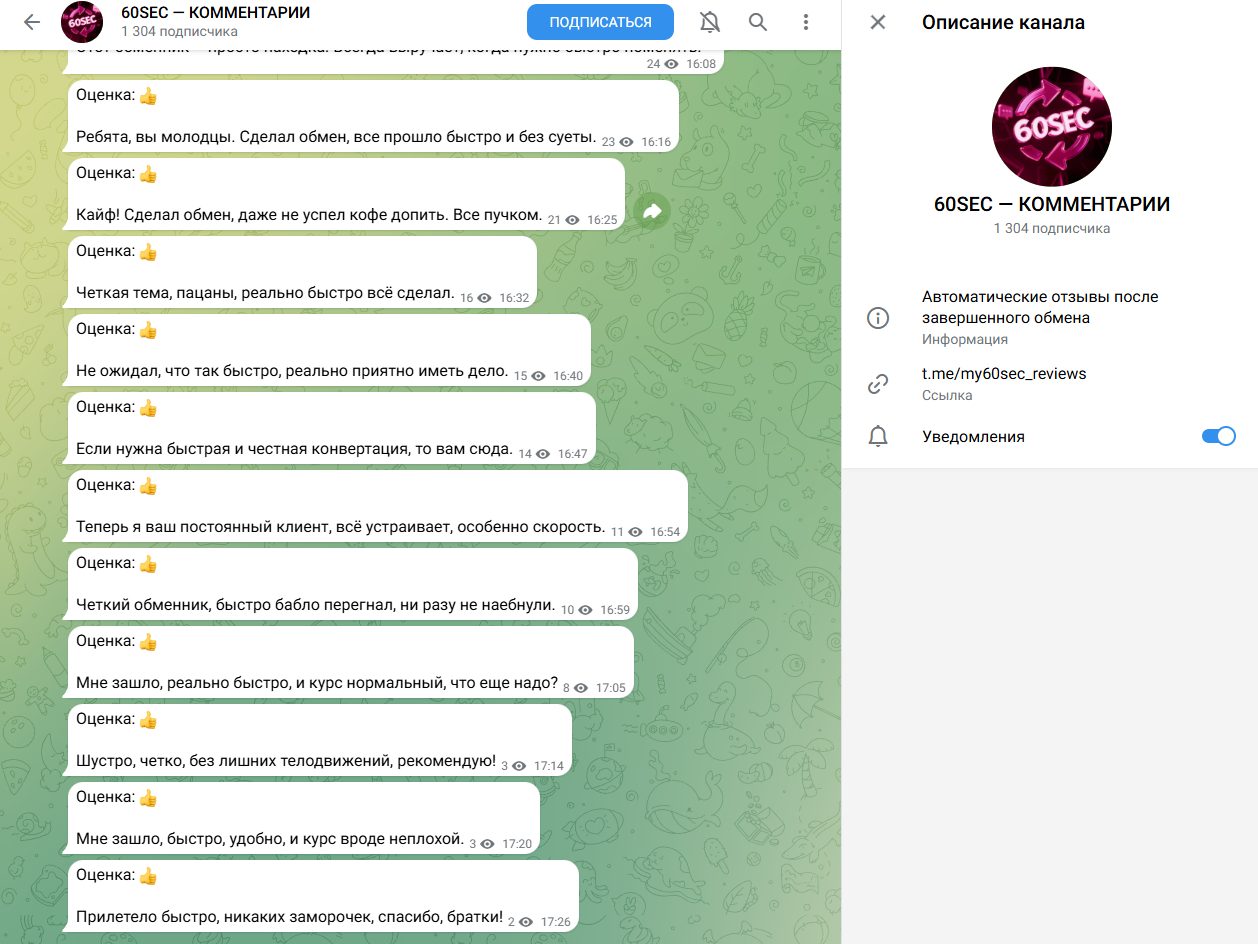 Обзор обменника Obmen60Sec: отзывы клиентов, как работает Obmen60 Bot