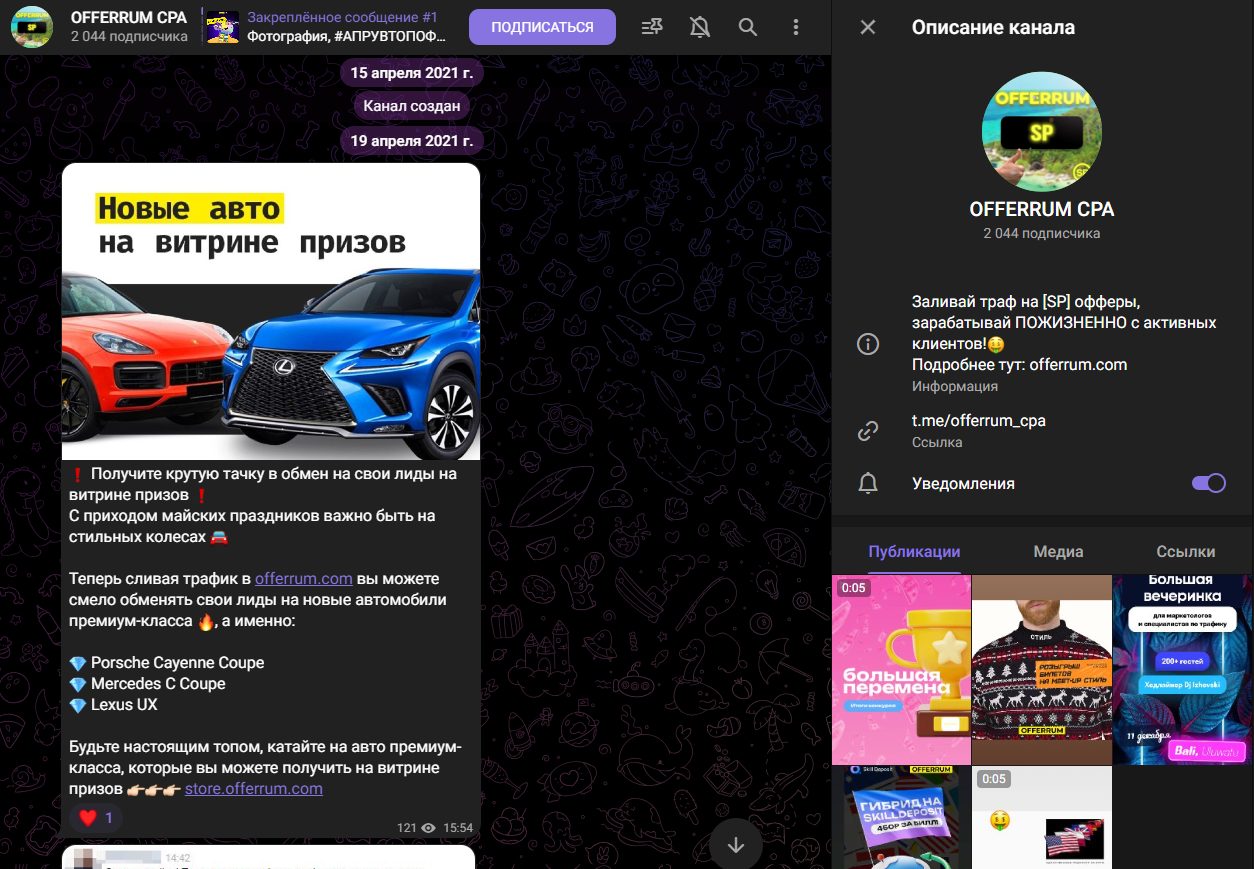 В шапке профиля тг-канала подписчикам предлагают «заливать трафик на [SP] офферы и пожизненно зарабатывать с активных клиентов». Сам профиль был зарегистрирован в апреле 2021 года. Первый опубликованный пост предлагает получить автомобиль в обмен на лиды на витрине призов: