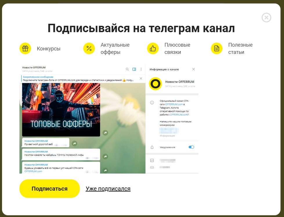 При переходе на сайт система автоматически предлагает присоединиться к публичному телеграмм-каналу. Offerrum com уточняет, что в мессенджере всегда можно найти актуальные офферы, плюсовые связки, полезные статьи. Также в Телеграмм якобы часто проводятся выгодные конкурсы.