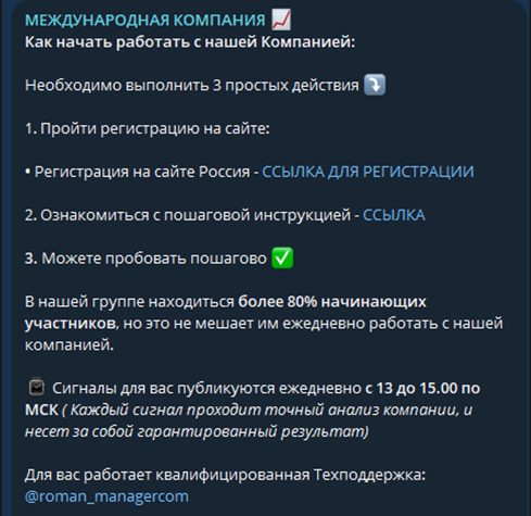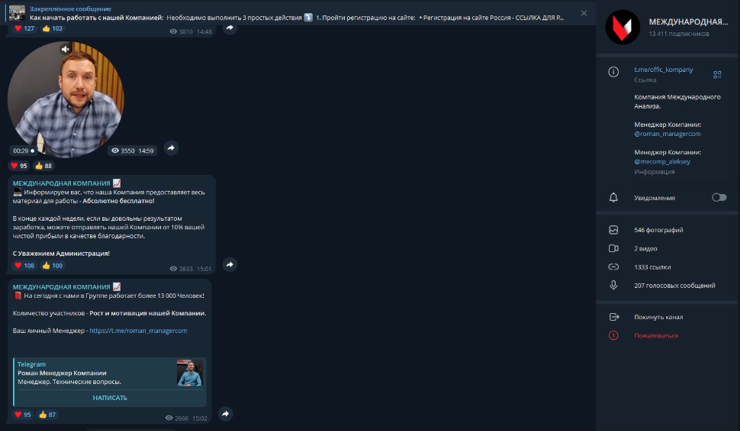 Не так давно на просторах Телеграма появился канал под названием «Официальная Компания Work Company». Якобы это единственный официальный ресурс в соцсетях крупного международного инвестиционного проекта. Администраторами каналы являлись Mecomp aleksey и Roman managercom. Первый отвечал за связи с инвесторами и принимал заявки на сотрудничество, второй – рашал техническую сторону вопроса, отвечал за прием средств и выплаты.