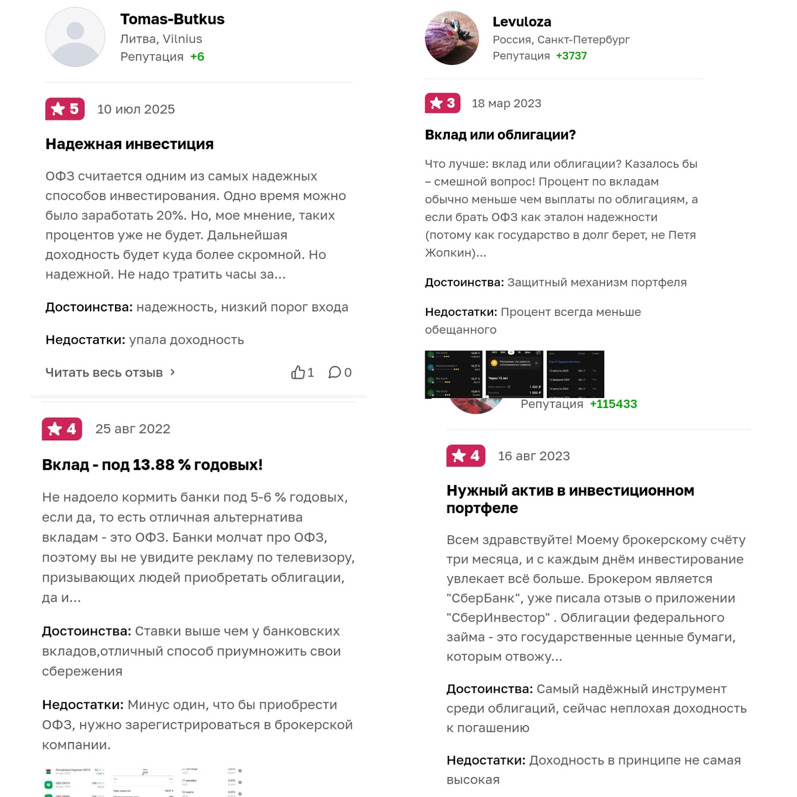 В сети мы нашли разные отзывы держателей ОФЗ, в которых рассказывают все за и против инвестиций в данные облигации. Некоторые сообщают, что инструмент является надежным, предлагающим ставки выше, чем у банковских вкладов.