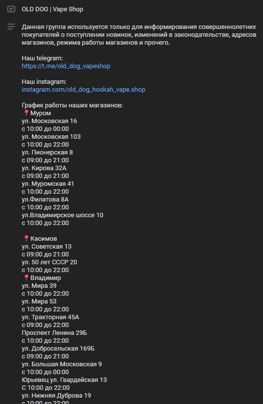 К моменту обзора у вейп шопа ОЛД ДОГ есть точки примерно в 17 городах РФ. Это регионы, расположенные немного на востоке от Москвы: Владимирская (большинство здесь), Нижегородская, Рязанская и Ивановская области.