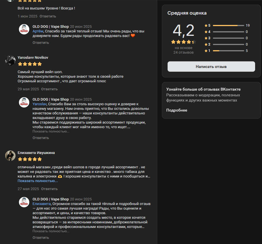 В группе магазина в ВК есть раздел с отзывами ОЛД ДОГ. Здесь администрация отвечает на каждый комментарий и негативные не удаляются. Но их мало и связаны они со скоростью ответов менеджеров в VK.