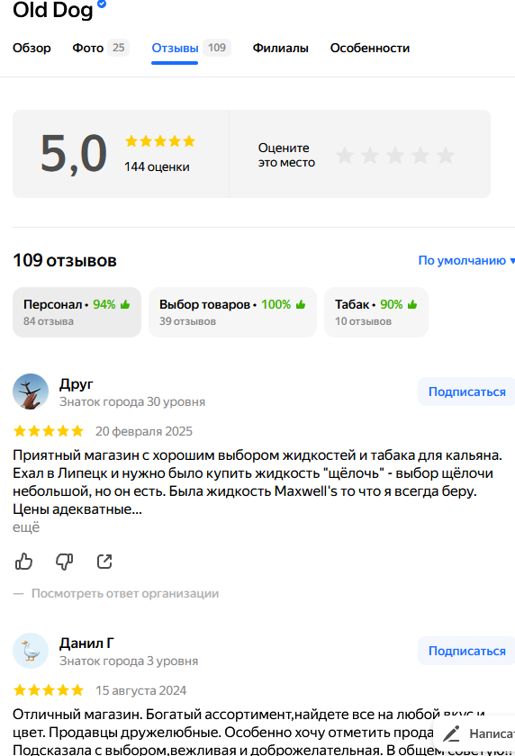 Сеть магазинов ОЛД ДОГ работает в оффлайне, то есть магазины размещены в разных городах. Это снижает риск обмана, но все равно перед посещением заведения стоит проверить информацию о нем и отзывы в интернете. Чем мы и займемся в данном обзоре на OLD DOG Vape Shop.