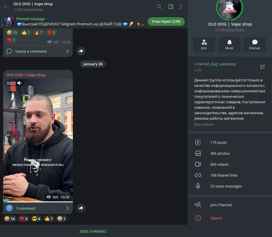 В Телеграмме OLD DOG Hookah Vapeshop контент дублируется. Здесь открыты комментарии, но особой активности в них аудитория не проявляет. Также доступны реакции, причем недовольные тоже. Здесь вовлеченность подписчиков уже выше, как и по просмотрам в целом.