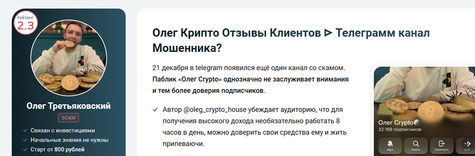 На проект «Олег крипто хаус» Третьяковского отзывов нет, но зато есть многочисленные обзоры проекта. И все они написаны в негативном ключе.