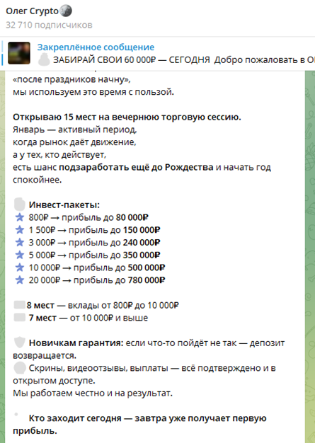 Вся деятельность нашего героя ведется исключительно в телеграм-канале Oleg crypto house. В описании его сказано, что сотрудничать с Третьяковским может абсолютно каждый, даже новичок и всем без исключения обещана легкая прибыль. На аккаунт подписано более 32 000 пользователей, но фактически, большая часть из них боты. Так как просматривают публикации не более 1000 подписчиков и комментарии закрыты.
