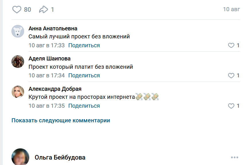 Реальных отзывов о проекте нет вообще. Ни на странице, ни в сети. Есть только короткие реакции пользователей с плюсами, которые не описывают опыт и не подтверждают выплаты.