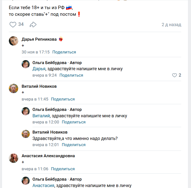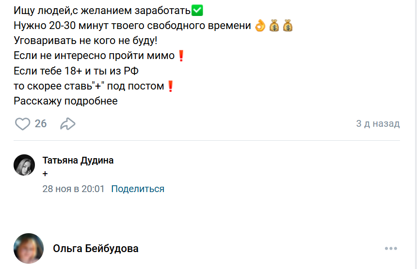 Если смотреть на страницу Ольги глазами человека, который ищет легкий заработок, кажется, что перед нами активная девушка, нанимающая людей в “проект без вложений” и собирающая под каждым постом десятки плюсиков.