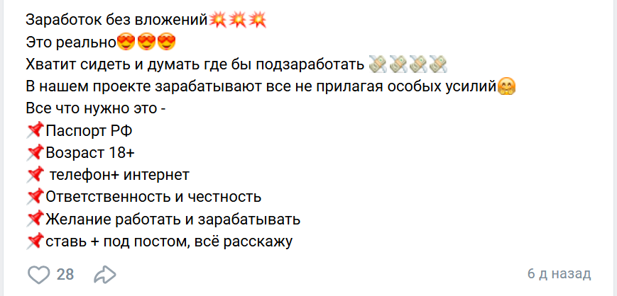 Но по всей ленте нет ни одного развернутого поста, где было бы рассказано, что это за проект, откуда берутся деньги, что нужно делать, какие условия и доход, чем рискуют участники, какие доказательства выплат. Все это повторяет паттерны, используемые на ВК для заманивания в финансовые пирамиды.