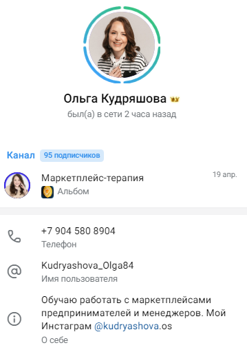 Также Оля продвигает проект через Телеграм. Ее профиль в ТГ называется Kudryashova Olga84.