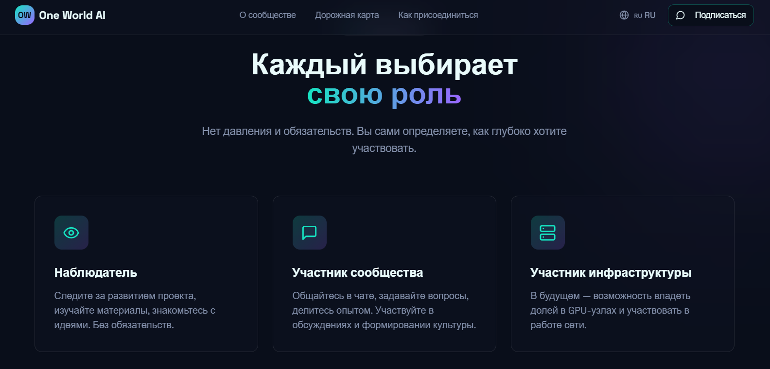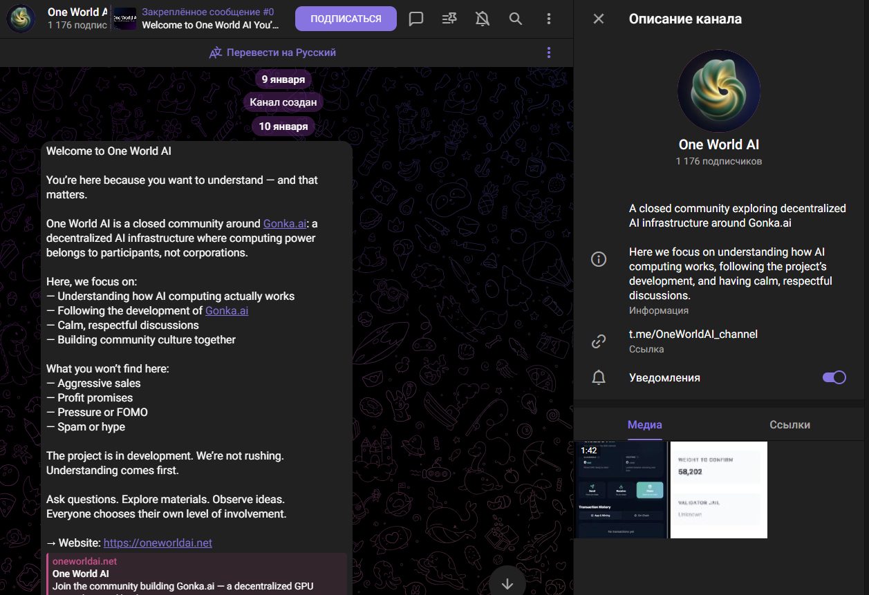Присоединиться к сообществу можно только по приглашению, предварительно обязательно ознакомившись с идеей Gonka ai. Вход только по рекомендациям от уже действующих участников OneWorldAi – достаточно серьезный барьер для аудитории.