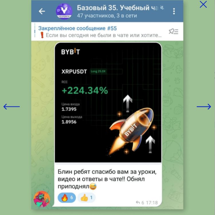 На сайте онлайн-школы публикуются отзывы учеников, взятые из тематического инфокомьюнити в Telegram. Ученики благодарят за уроки, видео и поддержку в чате. Однако на скрине можно заметить, что торгует выпускник на нелегальной биржи ByBit, у которой нет лицензии на работу в России.