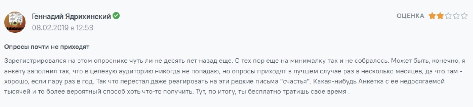 Но не стоит надеяться на перманентно огромные заработки. Во-первых, вы можете просто не подойти под целевую аудиторию, а потому не будете допущены к участию в некоторых опросах.
