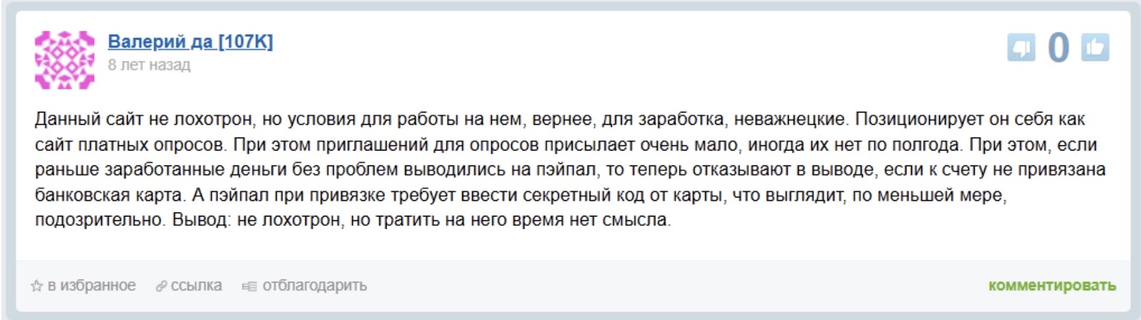 Основные претензии связаны с малым количеством задач, из-за чего проседает доход, и проблем с выводом. Также некоторые упоминают, что за некоторые пройденные опросы награда не начисляется.