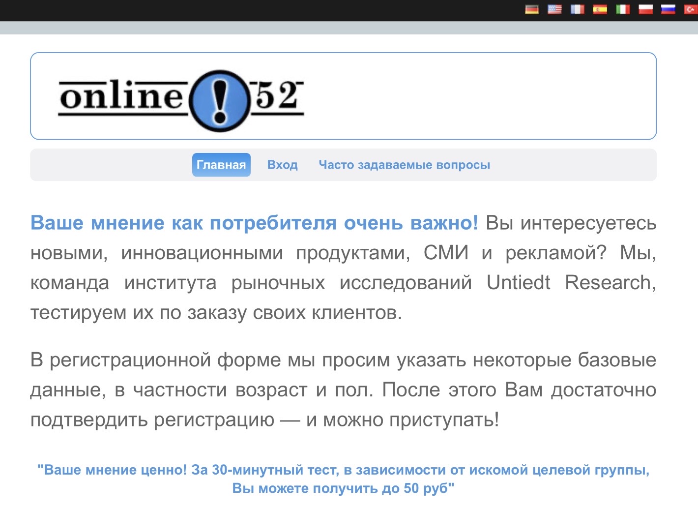 Онлайн 52 — это российское «представительство» немецкого сервиса, где с целью роста продаж различных товаров и услуг проводят анкетирование потребительского сегмента.
