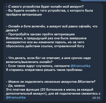 OnlineVK Bot — бот в Телеграмме, который обеспечивает поддержание статуса «Онлайн» на ВК-странице. Доступ к функционалу сервиса является бесплатным.