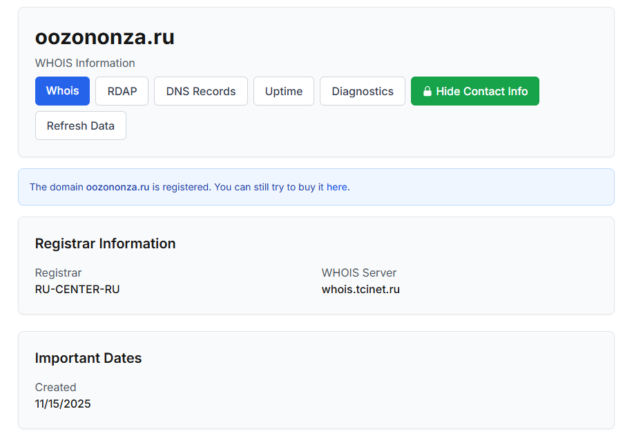 По данным Whois, домен проекта был зарегистрирован в ноябре 2025 года через регистратор Ru-Center-Ru. Сервис привлекает вклады клиентов и самостоятельно распределяет их по выгодным направлениям. На официальном сайте «Оозононза» есть лишь расплывчатое упоминание о лицензии, сканов документов нет, владельцы и команда остаются анонимными, а связь предлагается только через телеграмм-канал.