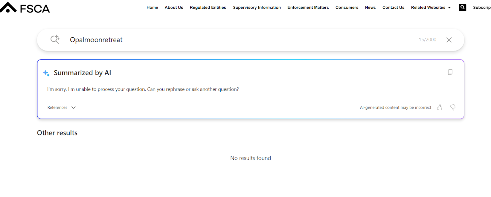 Получается, что организация работает менее года. Статистики с достижениями Опалмунретрит не опубликовано. На платформе есть информация о наличии лицензий от: FSCA, SMV и прочих регуляторов. На самом деле ни в одной базе рассматриваемый брокер не числится.