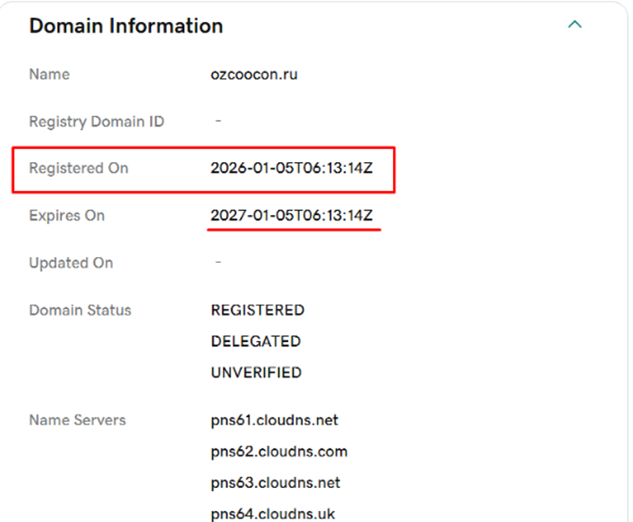 Мы осуществили проверку возраста домена и оказалось, что платформа начала работу в январе 2026, но уже через месяц оказалась недоступна.