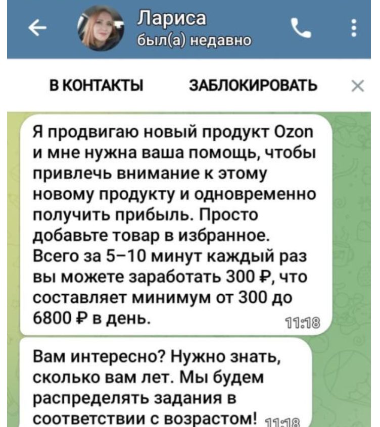 Заманивают в ловушку через рассылку сообщений в Телеграмме. Менеджер подставной компании утверждает, что нужна помощь для привлечения к новому продукту – необходимо “просто добавить товар в избранное” и буквально за 5-10 минут заработать 300 руб. Якобы прибыль в день может достигать 6800 руб. Подобные обещания для соискателей без специальных навыков могут исходить только от аферистов.