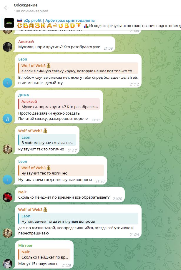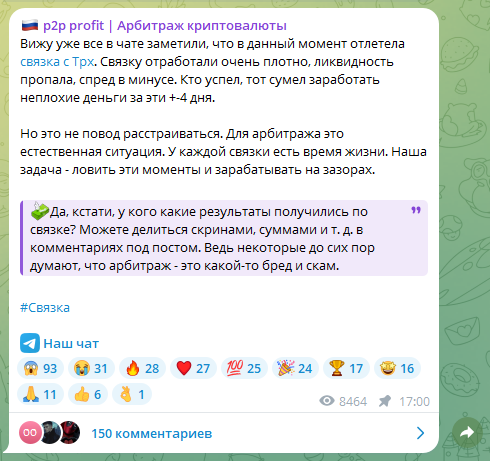 На момент написания обзора в середине января 2026 года ТГ-канал «P2p Profit Арбитраж Криптовалюты» насчитывал почти 29 тыс. подписчиков. Каждый пост набирает 9–11 тыс. просмотров, что довольно много. В декабре 2025 года админ решил открыть комментарии. С тех пор под постами живо ведется обсуждение связок и прочих криптовалютных тем. В среднем набирается от 80 до 150 комментариев. Такая высокая вовлеченность аудитории не характерна для мошенников.