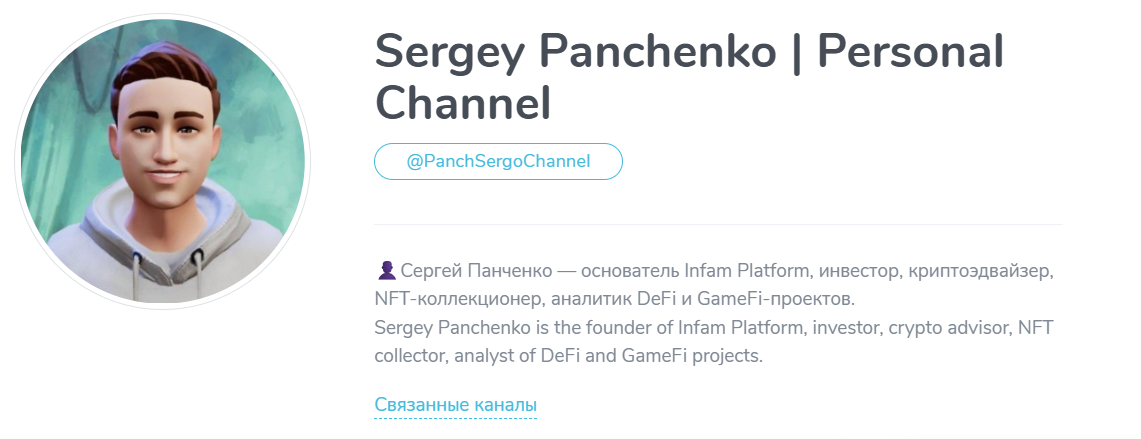 Более точные запросы позволили выйти на персонажа, который может иметь отношение к герою обзора. Парень заявляет о создании собственной компании Infam Platform. Он позиционирует себя в качестве инвестора, коллекционера NFT и DeFi-аналитика. Кроме того, Сергей Панченко показывает себя в качестве знатока проектов DeFi.