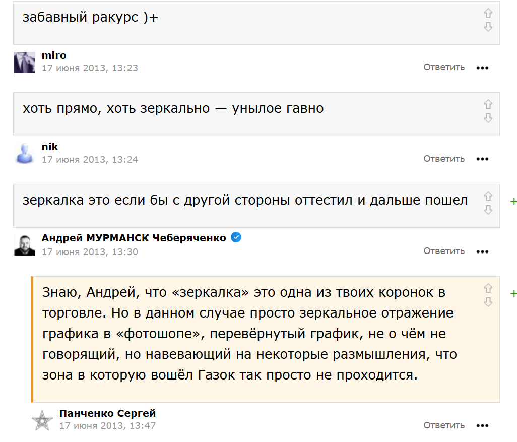 В публикациях герой обзора рассказывает об успехах на бирже. Он показывает графики и знания технического анализа. Для лучшего понимания трейдер проводит собственный анализ и дает прогнозы на ближайшее изменение цены. Наибольший упор делается на акциях крупных компаний России, к примеру, Газпрома.