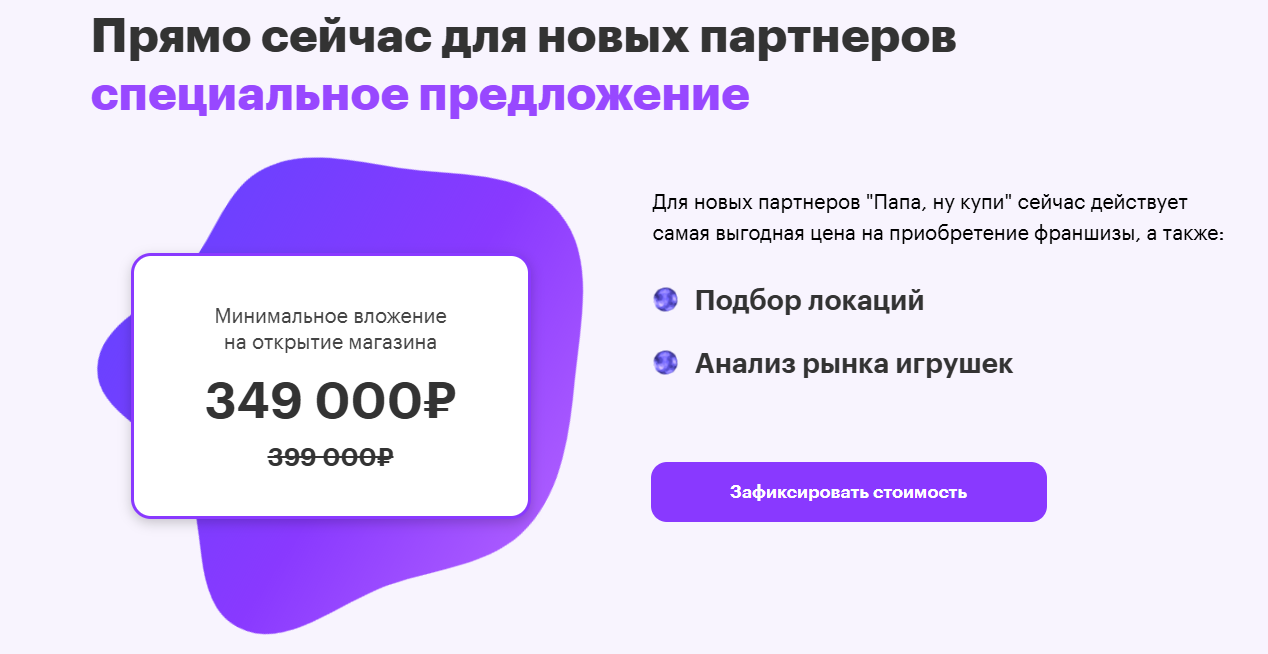 Минимальный капитал для участия во франшизе – ₽349,000. В стоимость также входит подбор локации, анализ рынка игрушек и бесплатные консультации.