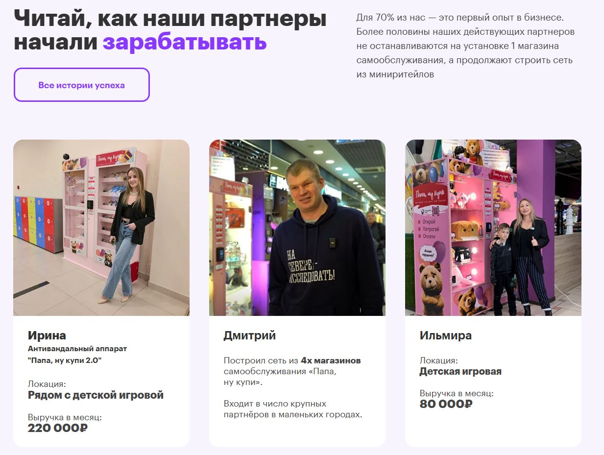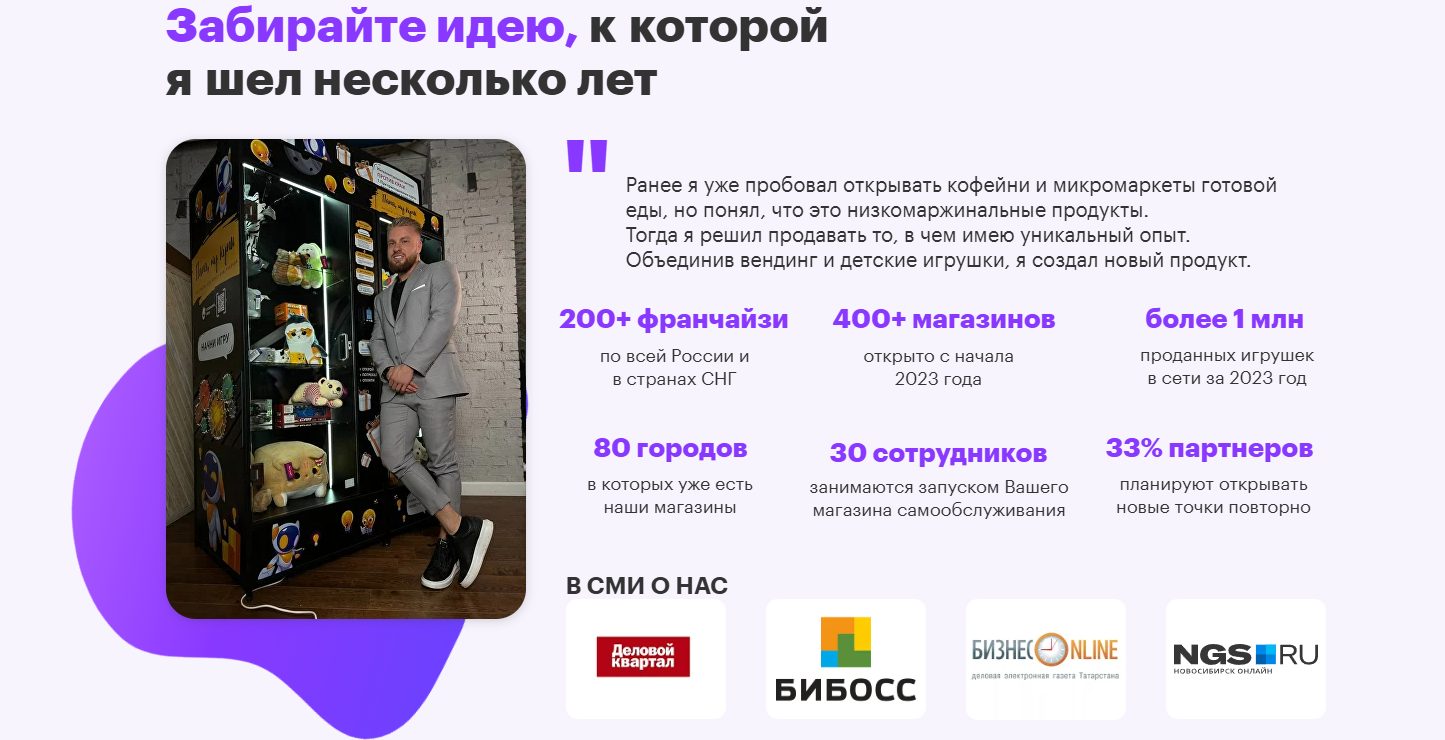 На сайте проекта команда делится успешными кейсами франчайзи, которые якобы зарабатывают ₽80,000-220,000 в месяц на продаже игрушек.